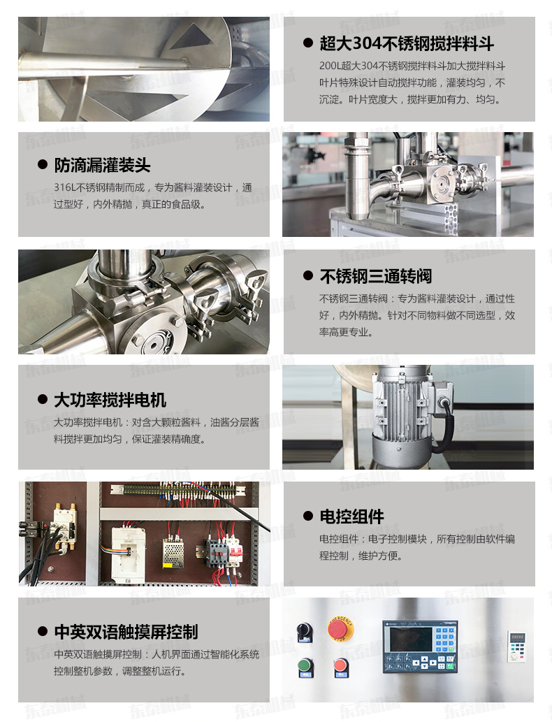 4.大功率攪拌電機(jī):對(duì)含大顆粒醬料,油醬分層醬料攪拌更加均勻,保證灌裝精確度
