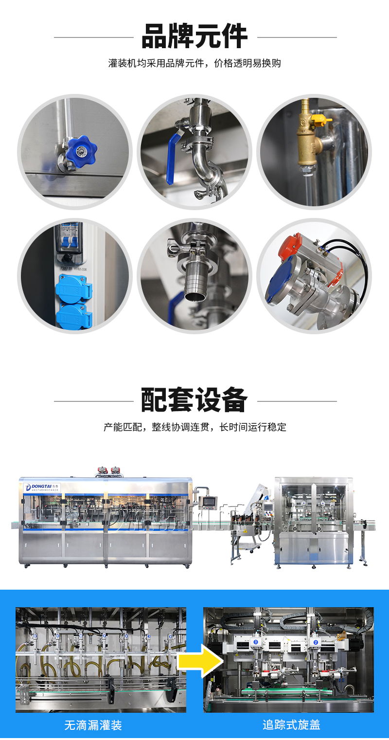 該灌裝機可以配置 高速旋蓋機 油桶貼標機 油瓶噴碼機 油壺自動自動裝箱碼垛機。組成油脂灌裝包裝流水線。節能、自動化的設備。