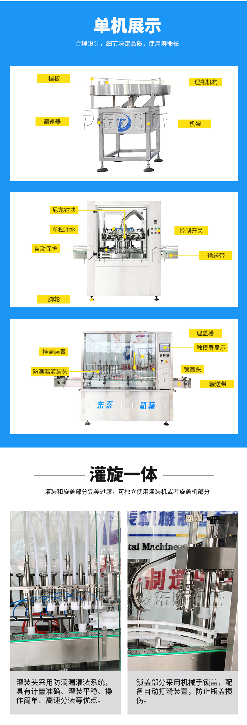 本灌裝流水線設(shè)備具有穩(wěn)定可靠、自動(dòng)化水平高,相比同類產(chǎn)品有著更長的使用年限,維護(hù)簡單,整線中各設(shè)備的協(xié)調(diào)性、連貫性強(qiáng),整線設(shè)計(jì)合理等特點(diǎn)。灌裝設(shè)備采用獨(dú)家專利系統(tǒng)結(jié)構(gòu),為當(dāng)今行業(yè)內(nèi)水平,整
