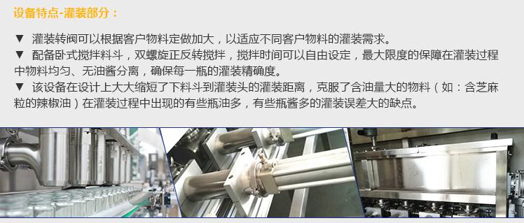 產品簡介 灌裝機采用活塞式灌裝原理,適用于調味品中帶顆粒并且濃度較大的辣椒醬、豆瓣醬、花生醬、香菇醬、果醬、牛油火鍋底料、紅油火鍋底料、蝦醬等較為粘稠醬類的灌裝。 產品優勢 1、該機