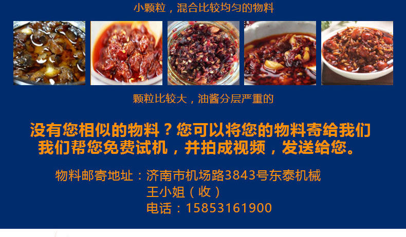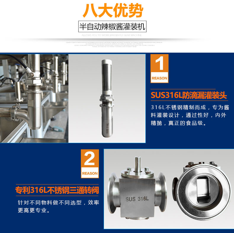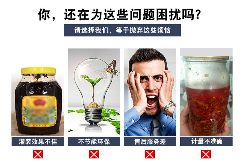 適用范圍:小型辣椒醬灌裝機主要適用于那些含顆粒的顆粒漿狀流體、半流體、膏體、醬狀類的物料灌裝,各種勻質醬料、火鍋底料、老干媽辣椒醬、干煸牛肉醬、泡椒、牛肉粒醬、香菇丁醬、八寶菜、蘿卜丁、含干煸臘肉丁、辣子雞丁、油炸花生等大顆粒、含油量少等干煸辣椒醬的灌裝。
