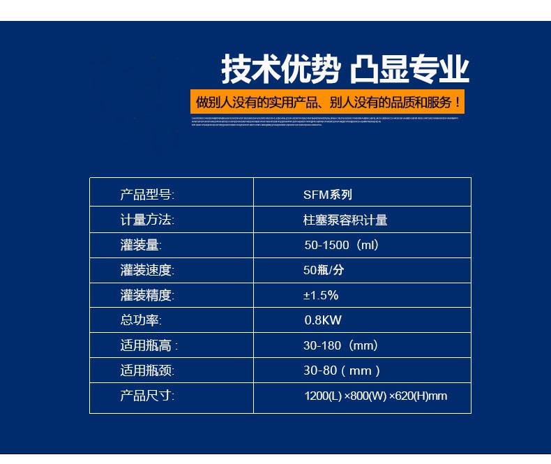 產品簡介:半自動醬類醬料灌裝機SFM系列結構合理、機型小巧、性能可靠、定量準確、操作方便。整機304不銹鋼,灌裝悶頭防漏料防滴油,氣缸驅動結構,加大200L料斗,品牌全鋁殼銅芯大功率攪拌電機,變頻調速,PLC智能控制,用戶可根據需要任意調節灌裝量及灌裝速度,灌裝精度高。