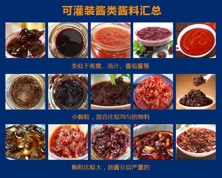 醬料灌裝生產線采用活塞式灌裝原理,適用于調味品中帶顆粒并且濃度較大的辣椒醬、豆瓣醬、花生醬、香菇醬、果醬、牛油火鍋底料、紅油火鍋底料、蝦醬等較為粘稠醬類的灌裝。
