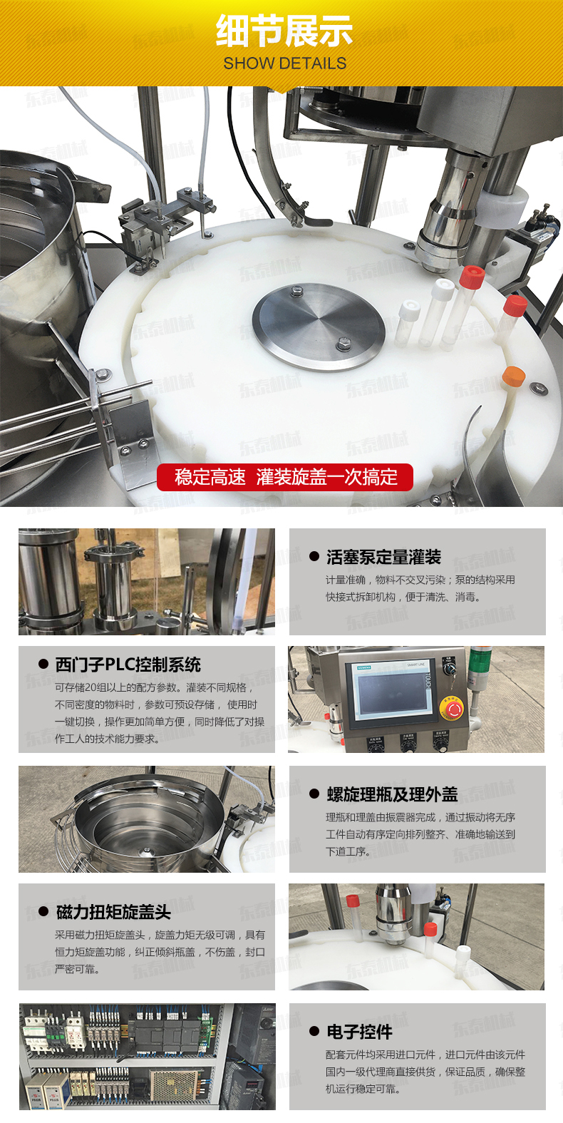 診斷試劑灌裝旋蓋一體機(jī)在性能上、質(zhì)量上液體灌裝機(jī)具有高速、可靠性強(qiáng)、產(chǎn)量高等優(yōu)點(diǎn),為整個(gè)行業(yè)的發(fā)展來說帶來了巨大的發(fā)展商機(jī),也為液體類商品帶來更廣闊的發(fā)展前景。液體灌裝機(jī)的操作簡(jiǎn)便,運(yùn)行穩(wěn)定,能有效節(jié)省企業(yè)成本,即可單機(jī)使用,也可進(jìn)行搭配理瓶機(jī)、液體灌裝機(jī)、旋蓋機(jī)、封口機(jī)、貼標(biāo)機(jī)等等設(shè)備組成一條生產(chǎn)流水線作業(yè),各單機(jī)能獨(dú)立完成其工作,有獨(dú)立的操作系統(tǒng),各單機(jī)聯(lián)動(dòng)、分離快捷,并且調(diào)整快速、簡(jiǎn)單,使生產(chǎn)的每個(gè)工序保證協(xié)調(diào)。廣泛應(yīng)用于食品、化妝品、醫(yī)藥、油脂、日化、洗滌劑、農(nóng)藥、化工等行業(yè)的灌裝。