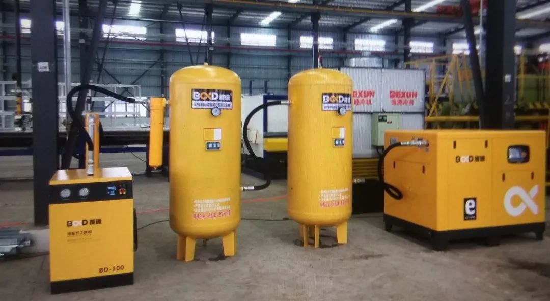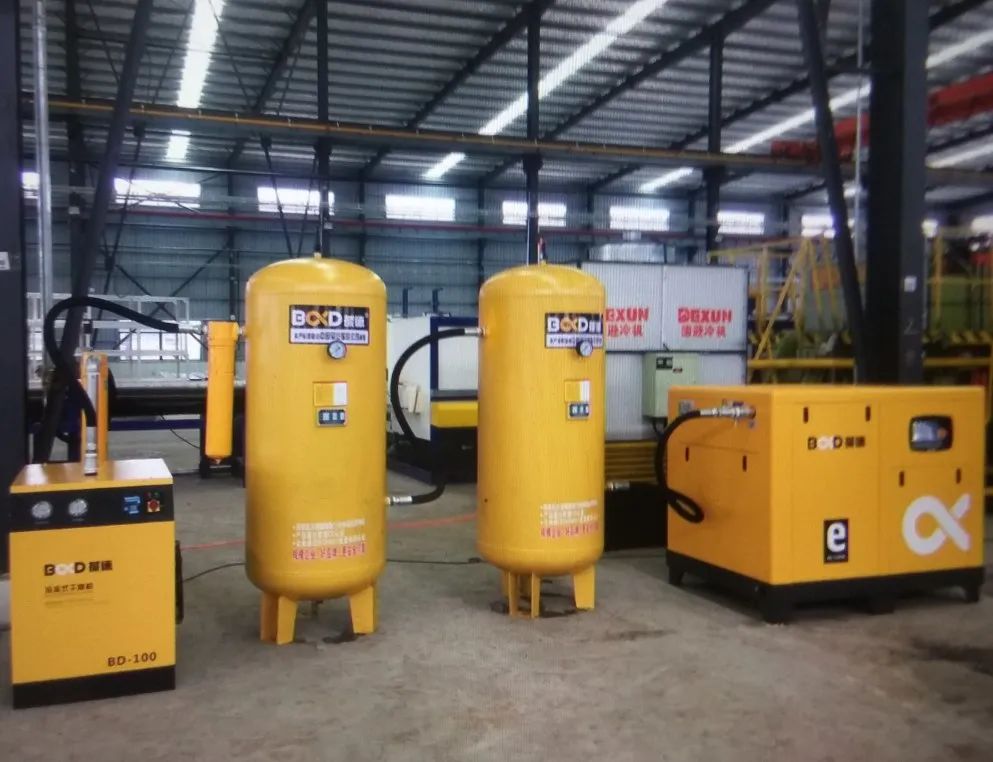 ?、?管道口徑:排氣管道的管徑應不小于空壓機機排氣口的尺寸,可視壓縮空氣輸送距離的遠近適當的加大管徑,以減小壓損。