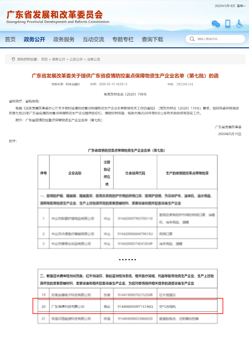 近日,廣東省發(fā)展改革委公布了《廣東疫情防控重點保障物資生產(chǎn)企業(yè)(第七批)名單》。