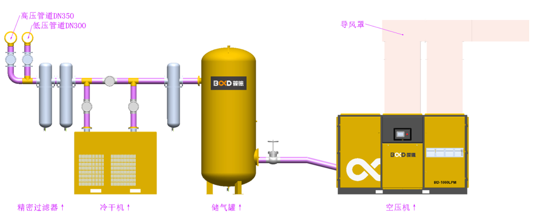 配置過濾器除去氣體中的雜質(zhì)顆粒和油,過濾精度達(dá)到0.01μm,過濾器出口處的壓縮空氣含油量低于0.3mg/m³,確保壓縮空氣的品質(zhì);儲(chǔ)氣罐可以根據(jù)壓縮空氣總需求量來確定容積。