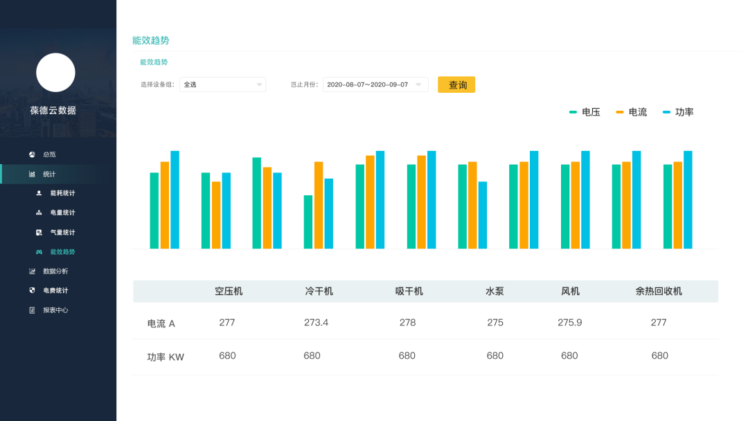 空壓機(jī)、冷干機(jī)、吸干機(jī)、水泵、風(fēng)機(jī)、余熱回收機(jī)等設(shè)備,電流、功率等信息一應(yīng)俱全,并自動(dòng)生成圖表,每臺(tái)設(shè)備運(yùn)行情況數(shù)據(jù)可視化。