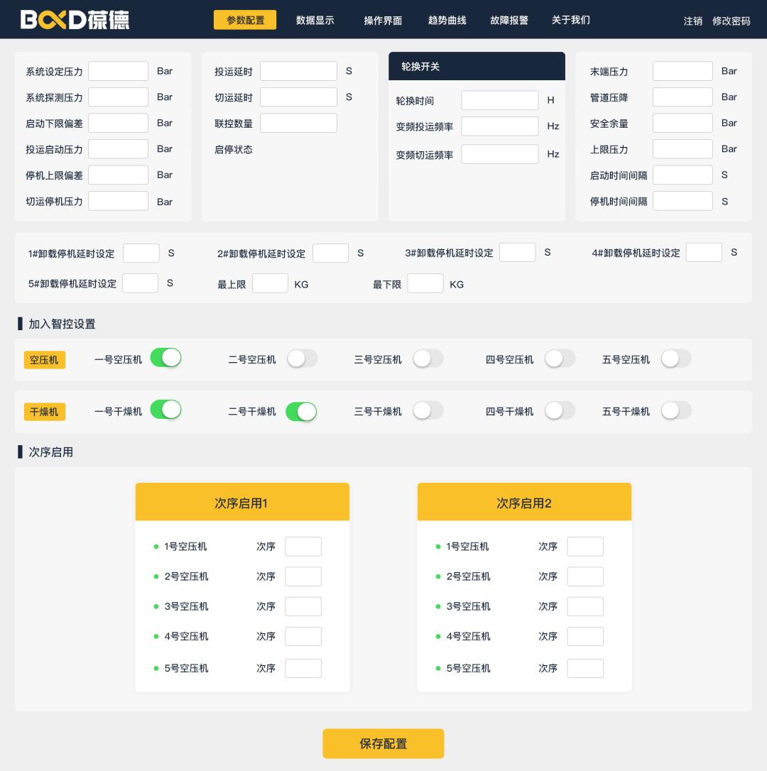 ? 現(xiàn)場(chǎng)設(shè)備層:主要包括現(xiàn)場(chǎng)空壓機(jī)的控制器通訊接口,冷干機(jī)硬接線(xiàn)信號(hào)接口、流量計(jì),功率計(jì),露點(diǎn)儀等各種傳感器;