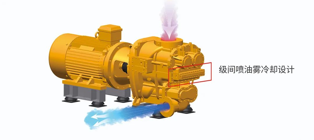 主機中有兩組轉(zhuǎn)子,空氣經(jīng)過第一級壓縮后,壓縮空氣進入冷卻通道,冷卻噴霧進行冷卻后,降溫后的壓縮氣體再次進入第二級轉(zhuǎn)子進行壓縮,使得空壓機二級壓縮更加接近等溫壓縮。