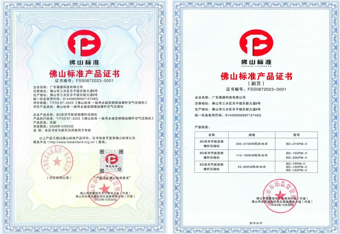 近日,佛山市場監(jiān)督管理局公布了《2023年第五批通過評價(jià)的佛山標(biāo)準(zhǔn)產(chǎn)品名單》,其中廣東葆德科技有限公司的BD系列節(jié)能變頻螺桿壓縮機(jī)成功入選佛山標(biāo)準(zhǔn)產(chǎn)品名錄。