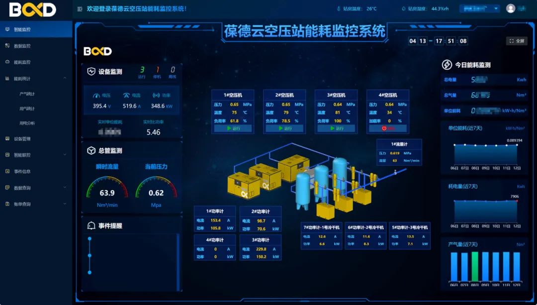 葆德一級能效數(shù)智空壓站,基于物聯(lián)網(wǎng)和AI的一級能效數(shù)智空壓站(截至發(fā)稿前,行業(yè)唯一一家市級數(shù)字化智能化示范工廠研發(fā)的軟硬件一體解決方案),通過對空壓站現(xiàn)場數(shù)據(jù)采集,準確的分析、計算、優(yōu)化空壓站及各臺機組氣電比、耗電量等關鍵數(shù)據(jù),同時結合實際需求,對各臺設備進行動態(tài)組合,智能調(diào)控空壓機組的加卸載(用多少氣產(chǎn)多少氣),減少耗電量,延長空壓機組設備壽命,可使用PC端及手機端實時能耗監(jiān)管、自動抄表、遠程管理,為企業(yè)實現(xiàn)安全生產(chǎn)、節(jié)能減排、降耗增效、精益管理。
