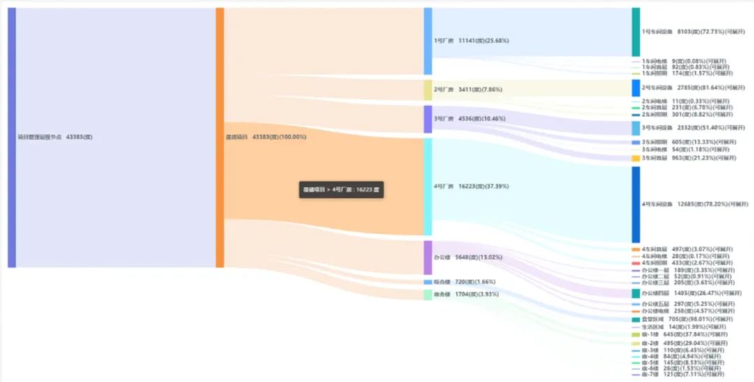 通過(guò)能源平衡圖、能源流量圖計(jì)算能源損耗值(線損、管網(wǎng)損耗),并計(jì)算出損耗數(shù)值,再把數(shù)據(jù)推送至管理人員,幫助用戶定位能源跑冒滴漏點(diǎn),從而減少能源的浪費(fèi)。