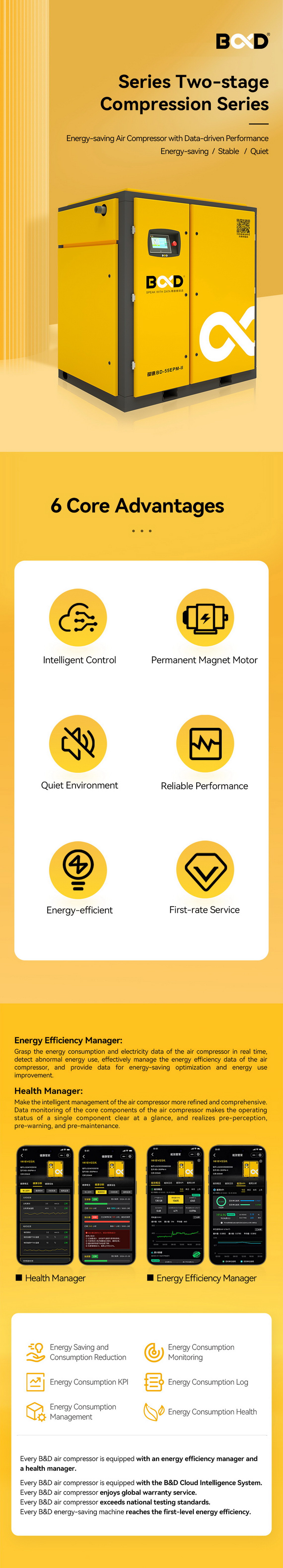 The innovative series two-stage compression design replaces the non-energy-efficient air compressor